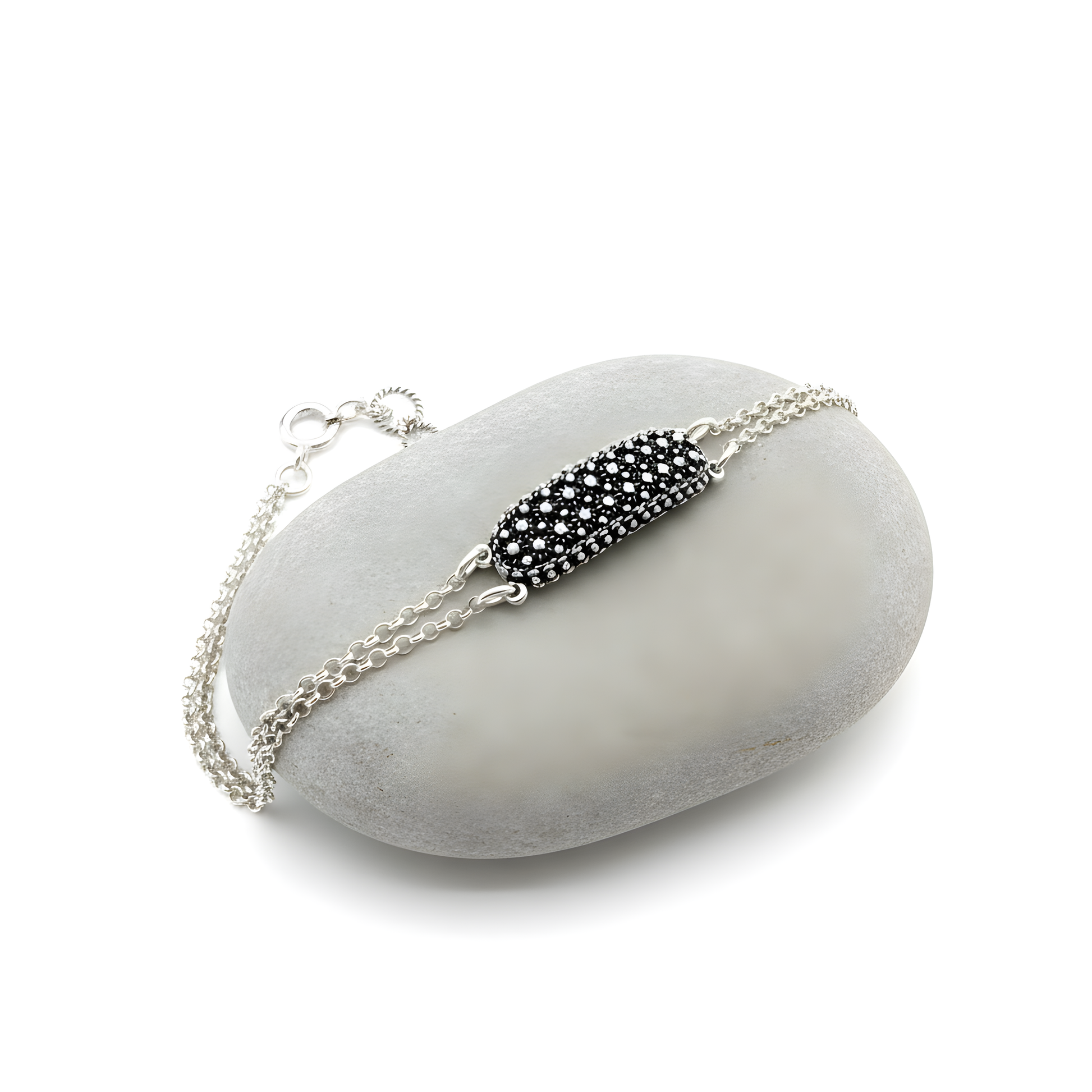 This 925 sterling silver bracelet features an elongated central element, finely crafted with a raised dotted texture that creates a rich, three-dimensional decorative effect. The double sterling silver chain adds brightness and balance to the design while ensuring durability and a comfortable fit. Equipped with an adjustable clasp, it adapts easily to the wrist, making it a versatile accessory ideal for refined everyday looks as well as more elegant occasions. A distinctive piece perfect for those who appreciate artisanal details and timeless style